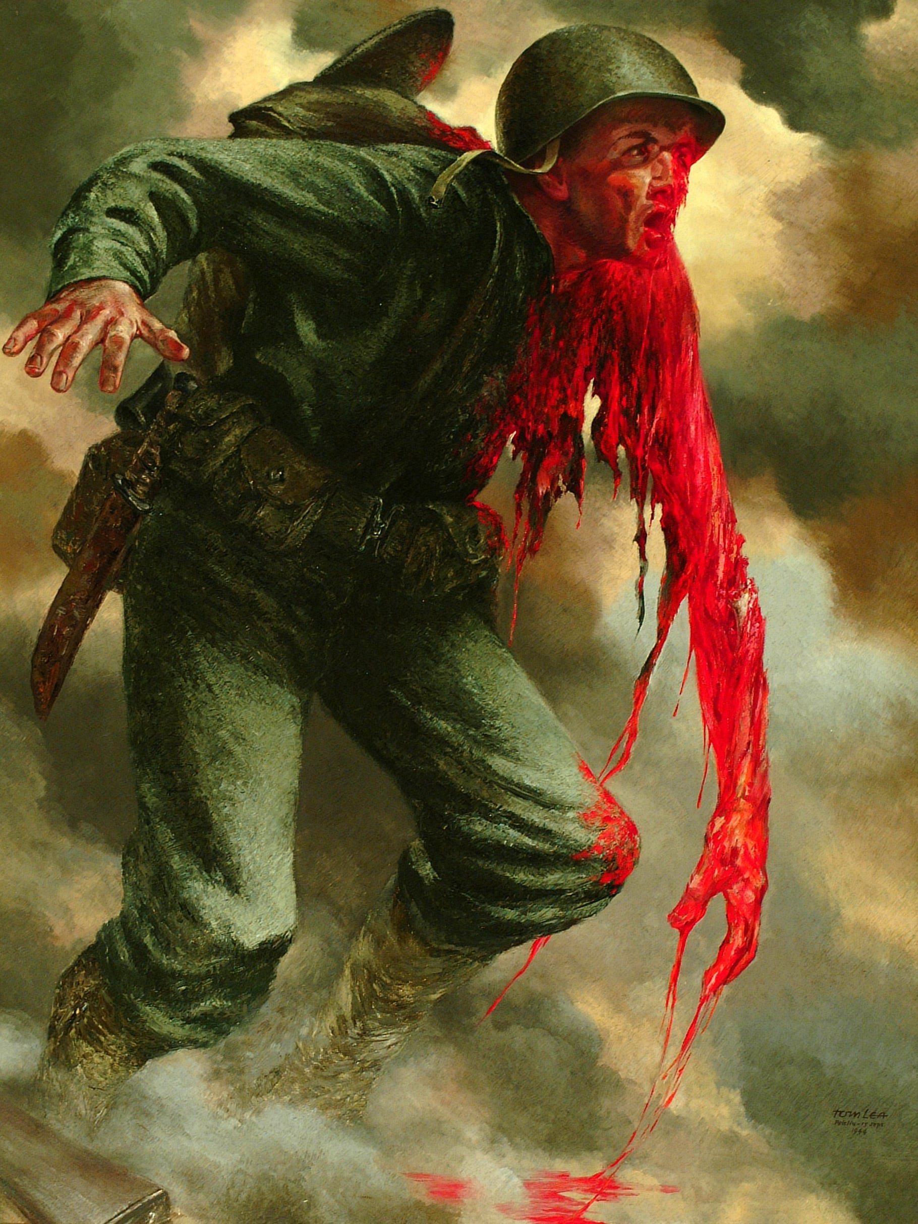 Unlike most WW2 era art Leas\'s work differed through it's use of vibrant color. The use of such extreme color capture's the viewers eye, intriguing them and making the reality of the war very jarring. His work was the first painting displayed in the National World War II Museum and is a stark contrast from the monotony of the black and white photos of war.